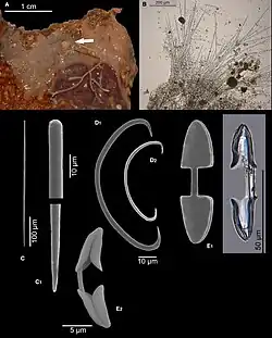 | Esperiopsis cimensis sp. nov., Holotype ZMA Por. 07282. A. Habit encrusting a volcanic rock (indicated by arrow). B. Cross section of peripheral skeleton showing plumose spicule brushes. C-E. SEM and light microscopy images of spicules. D. Style. D1. Detail of apices. C. Sigmas. C1. Large sigma. C2. Small sigma. E. Palmate isochelae. E1. Left: large chela in dorsal view; right: large chela in side view. E2. Small chela. | |
