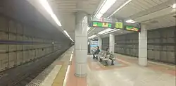 The station is located underground, with the station concourse on the 1st basement level and the platforms on the 2nd basement level. The station has one island platform serving two tracks.[1]