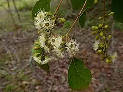 - E. baueriana Schauer subsp. baueriana is a tree to 20 metres (66 ft) with fruit 6–7 mm (0.2–0.3 in) long and 4–6 mm (0.2–0.2 in) wide;[11]