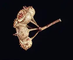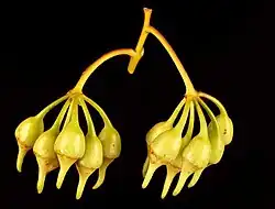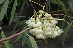 The flowers are usually borne in groups of nine, rarely eleven, in leaf axils on an unbranched peduncle 20–30 mm (0.8–1 in) long, the individual flowers on a pedicel 12–14 mm (0.5–0.6 in) long. Mature buds are oval, 19–22 mm (0.7–0.9 in) long and 7–9 mm (0.3–0.4 in) wide with a finely beaked operculum about 14 mm (0.6 in) long. Flowering mainly occurs from August to September and the flowers are pale yellow to creamy white. The fruit that follows is a woody, hemispherical capsule 7 to 10 mm (0.28 to 0.39 in) long and 9 to 13 mm (0.35 to 0.51 in) with a slightly flared rim.[4][5][6][3]