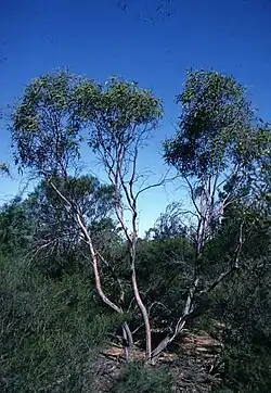 Eucalyptus beardiana, commonly known as Beard's mallee,[3] is a mallee that is endemic to Western Australia. It has smooth pinkish bark, narrow lance-shaped to curved adult leaves, flower buds usually in groups of nine, pale yellow flowers and down-turned, hemispherical fruit.