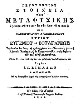 Eugenios Voulgaris or Boulgaris[1] (Greek: Εὐγένιος Βούλγαρης; Russian: Евгений Вулгарский, Евгений Вулгар; 1716–1806) was a Greek Orthodox cleric, author, educator, mathematician, astronomer, physicist, and philosopher. He wrote about every discipline: legal, historical, theological, grammatical, linguistic, astronomy, political, mathematics, archaeology, music, secularism, euthanasia, and the tides. He wrote speeches, poems, appeals to Catherine II for the liberation of Greece, and hundreds of letters. He edited valuable editions of Byzantine writers and classical books and translated many texts from Latin into French. He was one of the students of Methodios Anthrakites. He translated many important foreign language academic documents to Greek. He was bishop of Cherson (in Crimea). He was a leading contributor to the Modern Greek Enlightenment.[2]