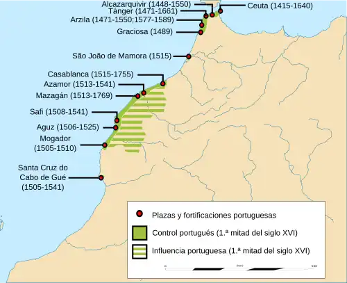 The Portuguese presence in North Africa dates from the reign of King João I who led the conquest of Ceuta in 1415.[14] and continued until El Jadida was abandoned in 1769. The enclaves, mostly along the Atlantic coast of Morocco, were known in Portugal as the "Algarve-Beyond-the-Sea" ('Algarve de Além-Mar'), or African Algarve,[15] in contrast with "European Algarve".