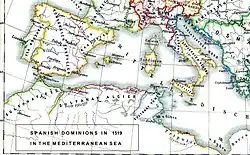 After having secured the Canary Islands off the coast of Morocco in 1496, they took a number of bridgeheads on the African mainland, first Melilla (1497), then Cazaza and Mers El Kébir (1505). The between 1508 and 1510 they extended the areas under their control widely, taking in Peñón de Vélez de la Gomera (1508), and then major coastal cities – Oran (1509), Algiers (1510), Béjaïa (1510) as well as Tripoli (1510) and surroundings in coastal Libya.[41] Spain however lacked the military means to extend its area of rule further. This limited success prompted the local Muslim rulers in North Africa to encourage Oruç Reis to attack Spanish positions and stage raids on Andalucia, Valencia and Alicante. In 1516, the year King Ferdinand died, Oruç took Algiers and expelled the Spanish.[42]