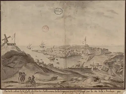 The 1684 treaty also transferred these rights from Napollon to M. Denis Dussault, before, under another treaty signed in 1690, all rights in these concessions were assigned to the French Africa Company.[59] The French Africa Company promptly abandoned the Bastion and based its trade in la Calle, where it continued to operate until it was wound up in 1799. In 1807 the Dey of Algiers ceded all former French rights for trading posts and bases to the United Kingdom, and they were not restored to France until the Congress of Vienna. During the diplomatic crisis of 1827 between Algiers and France, the French abandoned la Calle, and the Algerians promptly destroyed it. These events were the prelude to the French conquest of Algeria in 1830.[60]