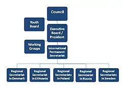 Since 29 October 2010 the Executive Board of the Euroregion Baltic is the highest decision-making body of the organisation. According to the new Statutes adopted by Council on that day, the Executive Board consists of up to two representatives of the highest possible political rank and one permanent deputy nominated by each member organisation and the Chairperson of the Youth Board.[18] The Board debates during formal meetings which may be ordinary or extraordinary. The meetings are held in English and in public unless the Board decides otherwise. Ordinary meetings must take place at least three times a year and they are summoned by the ERB President. Extraordinary meetings may take place at any time decided upon by the Board.[19] Decisions of the Board are based on consensus and each member organisation as well as the Chair of the Youth Board all have one vote. The Board has the right to initiate and adopt changes to the ERB Statutes; prepare and approve long-term programmes, biennial actions plans and other strategic documents; prepare, adopt and implement resolutions, joint statements and positions; elect ERB President and Vice-President; approve annual activity reports from the ERB President; approve annual activity and financial reports from the International Permanent Secretariat and the Youth Board; decide on enlarging of the ERB territory and approve withdrawal or suspension of the Parties; establish ad hoc task forces; confer the title of the ERB honorary membership.[20]