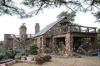 The Evelyn Gill Walker House is a historic house at 18 South Spruce Street in Paris, Arkansas. Built by mason Tolbert E. Gill over a several-year period beginning in 1938, it is a distinctive example of Gill's Rustic style, with a stone veneer exterior and decorative components. It has a 1+12-story gabled main section, with a flat-roof porch in front, and a flat-roof ell in the rear. The ell features a turret with a bell-cast top, with a surrounding curved staircase leading to an open deck on the ell's roof.[2]