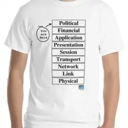 A network guru T-shirt[7] from the 1980s shows OSI Model layers with additional Layer 8 as the "financial" layer, and Layer 9 as the "political" layer. The design was credited to Evi Nemeth.