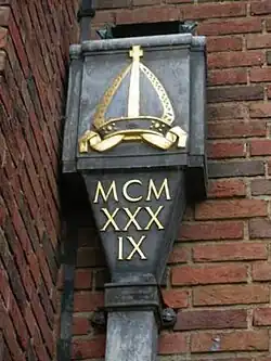 After the South Door entrance is St Ursula’s Porch with Eric Gill’s carving over it of the Diocesan Coat of Arms and by the side of the porch is a plaque carrying the name "Maufe" and a crest above it. This is the signature stone of Edward Maufe. This door is also known as the “Bishop’s Entrance” and the door handles are shaped like a bishop’s crozier.[7]
