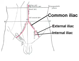 Front of abdomen, showing common iliac artery, the source of the external iliac artery | |