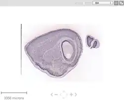 A search was performed on the Allen Brain Atlas using FAM149A. According to the levels of expression provided by the Atlas, FAM149A is not expressed in notable levels within the mouse brain. However, with visual observation of the figure, FAM149A could be found in the ventral posterior complex of the thalamus. This can be seen as the dark vertical line in the center of the sagittal brain slice in the image below. As a comparison, the expression of the protein, actin, is used to demonstrate what a mouse brain appears like with high levels of expression.[14]