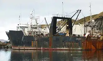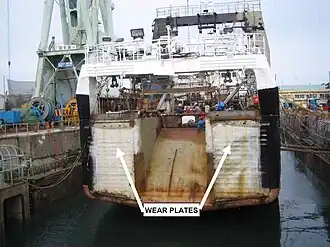 ![]() Wear plates fitted over stern of Alaska Ranger, shown in 2005. Stern ramp in the center allowed nets to be launched into the sea and then hauled on board with their catch.   | |