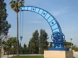 Another Fairbairn crane survives at Dover, on the quayside of Wellington Dock.[7] It is now a scheduled monument.[8] This is a hand-cranked crane of 1868, built by the Fairbairn Engineering Company of Manchester.[9] When originally installed it was rated at 50 tons and worked by four men. The Ordnance Department of the Royal Navy used it for handling cannon. In later years it was down-rated to 20 tons and was used for lifting yachts from what was now Dover Marina. In 2014 the crane was 'lovingly restored'[10] and repainted, with an obtrusive vertical steel prop beneath the jib.[11]