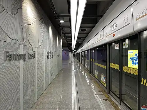 Fanrong Road (simplified Chinese: 繁荣路; traditional Chinese: 繁榮路; pinyin: Fánróng Lù) is a Shanghai Metro station located on Line 18 in Pudong, Shanghai. Located at the intersection of Fanrong Road and Hunan Highway, the station opened for passenger service on 26 December 2020.[1] It forms part of the first section of Line 18 to become operational, a southern segment of phase one of the line which consists of eight stations between Yuqiao and Hangtou.[2][3]