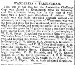 Greig's reward was to be chosen for the London representative side in the match against the Sheffield Football Association representative side, albeit not as a goalkeeper.[6] However, there are no further fixtures recorded for Farningham, which had been struggling in previous matches to put out a full side. On one occasion the club relied on a spectator to help fill out a 10-man side,[7] and two weeks before the Wanderers game the club only turned up with eight men for a match with South Norwood.[8]