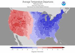 ![]() Average temperature departure for the United States in February 2015, showcasing the well-below average temperatures in the eastern half of the country | |