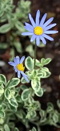 Felicia amelloides, the blue daisy bush or blue felicia, is a hairy, soft, usually perennial, evergreen plant, in the family Asteraceae. It can be found along the southern coast of South Africa. It grows as groundcover, and is cultivated as an ornamental, where it was introduced in Europe in the middle of the 18th century.[2][3]