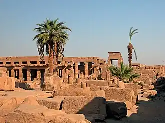 Built at the eastern end of Karnak's main axis, and enclosed in its own walls, this building is little understood and its exact purpose is still unclear.[2] It consists of three main parts, a suite of rooms dedicated to Sokar to the south-east, a solar complex to the north-east and the festival hall itself, from which the other areas of the building can be reached. This is known as the 'Hry-ib', or that which is at the heart of it.[3] The only original entrance was in the south-west corner. The walls contain the Botanical garden of Thutmosis III.