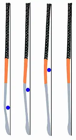 Using extreme examples is useful as a means of demonstrating effects that occur in less extreme configurations but are much more difficult to spot and therefore to explain. The first observation is an easy one (top left in the image captioned "Reversed head in various…"). If the stick head is rotated onto the reverse (lighter colour) the toe is not going to disappear into the ground to enable the reverse side of the stick to be presented to the ball—a vertical adjustment is necessary. Secondly (top right), if the handle of the stick is kept at exactly the same angle and rotated, a horizontal adjustment is necessary to bring the reversed head to a position where contact will be made with the ball. The third figure (bottom left) shows these adjustments having been made (and a change to the angle of the handle because the position of the hand holding the stick at the top would be about the same as it is when gripping the stick in the forehand position), but the area of stick head making contact with the ball is very small; so control may not be adequate. The fourth figure (bottom right) demonstrates that to get good contact with the ball on a larger area of the reversed head, it is necessary to move the handle much nearer to the vertical. This means the player must bring the ball in very close to the feet and come to a more upright dribbling position—this in turn impairs the ability to scan the pitch and keep the ball in peripheral vision at the same time—a considerable disadvantage when dribbling to evade opponents.