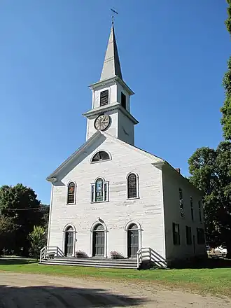 This structure was built in 1803, and is the town's oldest church building. Originally located at Harrington and Parsonage Hill roads, it was moved to its present location in 1818. It was originally built in the style of a colonial meeting house, with square pews and a gallery; the pews were removed during alterations in 1845–46, at which time the gallery level was built over into a second story. The building's Federal styling appears to have been inspired by the publications of Asher Benjamin, a resident of nearby Windsor, Vermont.[2]