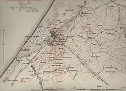 However, by 20 March the British considered the Ottoman Army defending Gaza and dominating the coastal route from Egypt to Jaffa, to be "steadily deteriorating."[5] Indeed it had been reported that Kress von Kressenstein complained of "heavy losses" caused by deserters, and between the EEF victory at Rafa in early January and the end of February, 70 deserters had arrived in the EEF lines. These were thought to be a "very small proportion" of the majority of Arabs and Syrians in particular, who disappeared from the Ottoman army, "into the towns and villages of Palestine and Trans-Jordan."[31] The EEF were unaware of the recent Ottoman reinforcements and thought the garrison at Gaza was 2,000 strong.[32] However, by the eve of battle there were probably almost 4,000 rifles defending the town, with up to 50 guns in the surrounding area, while a force of 2,000 rifles garrisoned Beersheba.[33][34][35]