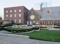 The church complex now occupies the entire city block, bounded by 12th and 13th avenues and Alder and Morrison Streets, but this was not the case before 2006. Since 1924, the Danmoore Hotel building had stood in the southeast quadrant of the block, directly abutting the porte-cochère[3] at the church's southernmost entrance, but it was demolished in 2005 to make way for an underground parking garage.[18] In 1988, the 118-room[23] apartment hotel and property, which had been acquired by some of the church's members, was donated to the church, under long-term plans to relocate its residents to replacement housing (known as the Alder House apartments)[10] located kitty-corner from the main church property, and redevelop the site. Following a 2001-launched fundraising campaign among members, plans for the redevelopment came together. The Danmoore's residents were relocated, the building was razed, and a three-story underground parking garage was built in the space, being completed in March 2006.[10] A landscaped plaza designed by Hennebery Eddy Architects was created on top of the parking garage,[18] at street level, and opened at the same time.[10]