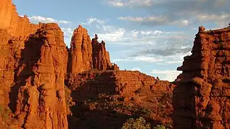 Fisher Towers are a series of towers made of Cutler sandstone capped with Moenkopi sandstone and caked with a stucco of red mud located near Moab, Utah (38°43′26″N 109°18′30″W / 38.7240°N 109.3083°W). The Towers are named for a miner who lived near them in the 1880s. The Towers are world-renowned as a subject for photography and for its classic rock climbing routes.[2][3]