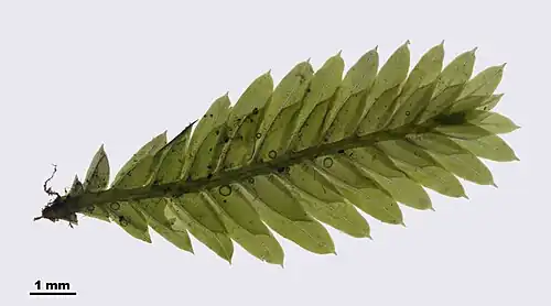 The individual leaves are oblong-lanceolate (spear-shaped) and measure 1.4–2.4 mm in length. A notable characteristic is the leaf tip, which comes to a sharp point (acute) and usually extends into a small projection (mucro or cusp). The leaves have a unique folded structure typical of Fissidens species, with the lower portion forming a sheath that wraps around the stem for half to two-thirds of the leaf length.[5] The species produces smooth rhizoids, unlike some related species like F. osmundoides which has papillose rhizoids (covered with small bumps).[7]