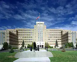 The facility was being prepared for closure by the Army during the economic depression of the 1930s.[2] In April 1933, Surgeon General R. U. Patterson sent a radiogram stating that Fitzsimons would be abandoned and all patients transferred.[2] However, Denver's reputation for treating tuberculosis and the consequences of losing 1,000 jobs at Fitzsimons led to citizen lobbying for Denver to be the site of a new Army hospital. U.S. Senator Lawrence C. Phipps was also a promotor of Fitzsimons Army Hospital and his efforts led to Congress approving funding in November 1934 to keep the hospital open.[2][6] The Army maintained the hospital in the budget for a few years before asking for work-relief funds to rebuild and modernize the facility in 1935. From 1935-1936 several improvement projects were carried out by the Works Progress Administration (WPA).[3] President Franklin D. Roosevelt visited Fitzsimons on October 12, 1936, and vowed to maintain the hospital.[2] In 1937, the land needed for construction of a new facility was officially turned over to the federal government, which paved the way for future development. In 1938, Congress approved $3.75 million in Public Works Administration funds for a new hospital and construction of a new main building, known as Building 500, began in January 1939 and was completed in 1941.[7][8] At the time, it was the largest structure in Colorado and the largest single hospital structure ever built by the Army.[5] The building completed with 290,000 sq ft, 1,800 rooms, ten stories, and 2,252 beds. The property was divided into two sections along a line extending through Monteview Street. Property north of the line was designated for commercial development. Property to the south was designated for medical and educational purposes, which is the current day School of Medicine and many hospitals. Building 500 got its name from its location exactly at the center of the south property and 500 yards from Montview Street. The building construction followed a Modernistic style, which was state-of-the-art for military hospitals at the time. The supervising architect for the Army Quartermaster Corps, L. M. Leisenring oversaw the design and construction of the building in a Modernistic Art Deco style.[7] Building materials included several blended colors of face brick, Texas sandstone, Yule Marble for the main entrance, Colorado Travertine stone for the walls, and granite for the paving and curbs under the entrance.[2] The grand portico above the main entrance was inscribed with three Latin phrases: Vita Brevis Ars Vero Longa, meaning "Life is short, art is enduring", Salus Virtus et Robur Artubus Scientia et Virtute et Bonis Artibus, meaning "Health, strength and vigor to the sinews (body) with the help of science, virtue and the arts", and Non Sibi Sed Proximo ,"Not for himself but for the next one to him". At the time the building was dedicated by Congressman Lewis on December 3, 1941, it had 290,000 sq ft and 608 beds.[3]