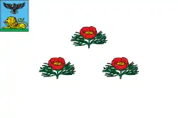 The flag of Belgorod Oblast, a federal subject of Russia, was adopted on 22 June 2000.[2] The flag consists of a blue cross, the four cantons colored (clockwise from top left) white, green, black and red. The white canton is charged with the coat of arms of Belgorod Oblast, consisting of a lion at rest and an eagle above it.[3] The ratio of the flag is 2:3.[4]