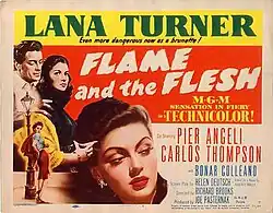 Flame and the Flesh is a 1954 American drama film directed by Richard Brooks and starring Lana Turner, Pier Angeli, Carlos Thompson and Bonar Colleano. It was made and distributed by MGM and produced by Joe Pasternak from a screenplay by Helen Deutsch based on the 1924 novel French Naples au baiser de feu by Auguste Bailly. The music score was by Nicholas Brodszky and the cinematography by Christopher Challis. It was shot at M-G-M British Studios[3] near London and on location around Positano and Naples in Southern Italy. The film's sets were designed by the art director Alfred Junge.