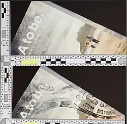 Footwear impressions can be lifted from surfaces with tools such as adhesive lifters, gelatin lifters or electrostatic lifting devices. These methods are similar to that of fingerprint lifting, which are lifted using one of the previously mentioned methods and then placed on a black or white backing card (depending on the color of the print substrate) to better see the details of the print and for evidence preservation purposes.[3] Adhesive lifters are essentially pieces of tape with a backing on them that are smoothly applied to the print, lifted off of the print and then attached to a backing card. Gelatin lifters are flexible gel sheets made of gelatin which are applied to the 2D impression in the same manner as adhesive lifters and then are covered by the plastic sheet provided with the gelatin lifters.[4] Electrostatic lifting involves the use of high-voltage current on a lifting plate to lift the elements of the print, without disturbing the area as much as traditional lifting methods do, followed by transferring the print from the lifting plate to a gelatin lifter or adhesive lifter.[3]