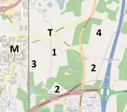 Forge Wood will be built in four phases.[20] The first phase will include most of the non-residential buildings, consisting of a community centre, shopping area, health centre and a 2,230-square-metre (24,000 sq ft) school building. Playing fields, a hard-surface games court and an area of parkland alongside the Gatwick Stream will also be created. Two new road links will be created: one leading on to Steers Lane to the north at Tinsley Green, and one on to the A2011 Crawley Avenue.[21] The "Phase 1" sector lies in the centre–west of the development area, wholly to the west of Balcombe Road. Phase 2 will occupy the southeastern part of the development area, east of Balcombe Road and south of a footpath which crosses the M23 motorway; a small area south of the Phase 1 development will also be added at this time. Phase 3 will form the westernmost part of the neighbourhood, between the already developed area and the railway line; and Phase 4 covers the northeastern part of the development area immediately north of the "Phase 2" sector. Two blocks of land totalling 5.18 hectares (12.8 acres) have been reserved for "possible future extension" at the north ends of the Phase 3 and Phase 4 areas. Other areas of undeveloped land not owned by the council totalling 11.99 hectares (29.6 acres) have also been identified.[20]