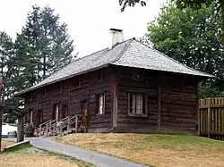 The fort's storehouse is a rectangular one and a half storey building with a hipped roof.[21] The storehouse is the only remaining structure that dates back to the original fur trading fort.[21] It was rebuilt in the 1840s after a fire which destroyed a similar building in 1839, and was the only building which survived the demise of the Fort as an active trading post. The Mavis family, who later purchased the land, used it as a barn for a number of years, until Fort Langley was recognized as a site of historic significance in 1923.