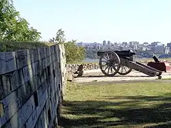 Native Americans appear to have lived in the area for thousands of years before the arrival of Europeans.[3] The bluff was the site of George Washington's 1776 encampment opposite Fort Washington at the northern end of Manhattan.[4] Fort Lee is named for General Charles Lee. The site is a reconstruction of the encampment including the blockhouse, battery, quarters as well as a visitors center. It is part of the Palisades Interstate Park Commission.