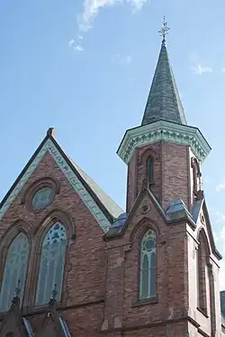 The church building was erected on the site of the former blockhouse of Maj. Gen. Eyre Massey.[2] It was designed by Scottish architect David Stirling during his partnership with Andrew Dewar.[3] Stirling's Early Gothic Revival style influenced the building's design.[4] Located at the corner of Queen and Tobin streets, it was built for $42,000.[5] John Brookfield began construction of the building, which was later finished by his son, Samuel Manners Brookfield.[3] The church cornerstone was laid on 25 June 1870 in Halifax, Nova Scotia, and the building officially opened on 10 December 1871.[6]