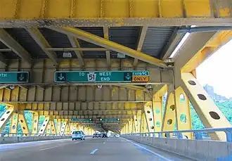 The Fort Pitt Bridge is a steel, double-decked bowstring arch bridge that spans the Monongahela River near its confluence with the Allegheny River in Pittsburgh, Pennsylvania. It carries Interstate 376 between the Fort Pitt Tunnel and Downtown Pittsburgh. Opened in June 1959 as a replacement for the Point Bridge, the Fort Pitt Bridge was the world's first computer-designed bowstring arch bridge[1]: 00:02:43  and double-decked bowstring arch bridge.[2] The bridge is known for its difficult lane changes, especially on the lower level, often requiring people to go from the extreme left lane across two lanes to the extreme right lane in only 700 feet.[3] The upper level is more forgiving for some routes but still requires a full span lane change in 700 feet to get from the south side entrance to the downtown exits.