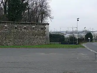 The fort is still used by the French Army. Units associated with the fort include a number of reserve units and the headquarters of the National Association of Reserve Warrant Officers. French Foreign Legion units associated with Operation Vigipirate are also stationed at Fort de l'Est.[1] The northeast bastion of the formerly four-sided fort was removed to make way for the A1 autoroute, from which the fort is visible, and faces the Lycée Suger secondary school, built in 1994. The military files concerning military insubordinations of World War I in the French Army are preserved there, as well as some unclassified files from the library of the former garrison.[2] The glacis of the fort is partly occupied by community gardens.