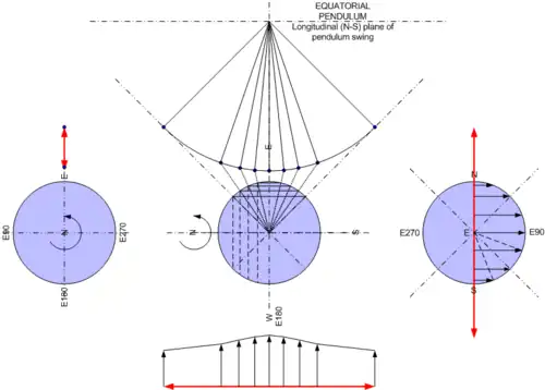 For the equatorial pendulum with a swing in the longitudinal (north-south) direction the surface velocity vectors on either side of the swing are balanced in the same direction and the center-point of the pendulum swing is moving along with the direction of rotation (see Figure 2A).