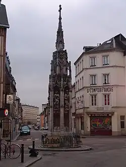 The Fontaine de la Croix-de-Pierre in Rouen is one of the few existing medieval fountains in France. It was built in 1517 next to a stone cross erected by the local bishop in 1197. It was demolished by the Calvinists in 1562, but was rebuilt. In 1792, during the French Revolution, the cross at the top was replaced by a bust of Marat. but this was removed in 1795. In 1872 the fountain was rebuilt according to the original plans. The original fountain can be seen in the garden of the Rouen Museum of antiquities.[5]