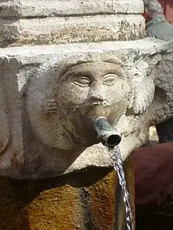 Fountain in Tourtoirac (Dordogne), probably dating to Roman times or earlier. The inhabitants have built a wall around a spring. - Barrel fountain in Basse-sur-Issole (1542). The iron rods over the fountain were designed to support jars and jugs as they were filled with water pouring from canons above.