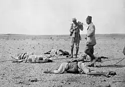 In Gregson's images, corpses, moving distant enemies and approaching death were captured in the instant. Some of these pictures show prisoners with traditional weapons and dress, like the characteristic jibba coats, – items that were later exhibited in British museums as trophies of war.[7][8] Furthermore, there are several photographs of dead bodies, some of them being plundered by Egyptian soldiers, like the picture entitled 'Looting after the Battle' in the original album.[9]