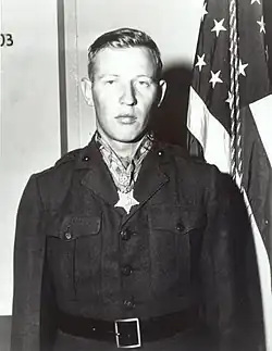 Private First Class Franklin Earl Sigler (November 6, 1924 – January 20, 1995) was an American Marine who received the Medal of Honor for his actions in the Iwo Jima campaign – a one-man assault on a Japanese gun position which had been holding up the advance of his company for several days, and for annihilating the enemy gun crew with hand grenades. Although painfully wounded during his attack, he directed the fire of his squad and personally carried three of his buddies who were wounded to safety behind the lines.