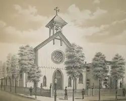 St. Veronica (Catholic) wood frame chapel and rectory at the entrance to the newly established New Cathedral Cemetery, Second & Butler Streets, erected 1872