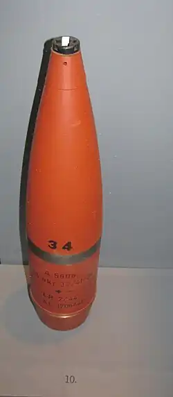 The 75 mm gun produced a relatively flat trajectory, enabling projectiles to ricochet or strike targets behind ridges, though this limited its ability to target areas within terrain folds.[note 5][41][10] Gunner training included techniques to adjust for this, such as using reduced charges and a curved trajectory plate to shorten the range, with an average combat distance of approximately 2,500 meters.[42][43] Available projectiles included shrapnel shells (for anti-personnel use), high-explosive shells (for equipment, structures, or entrenchments), grapeshot canisters (for short-range fire), smoke shells, tracer shells (for anti-aircraft use), incendiary shells, illuminating shells (with parachutes for night operations), and tear-gas shells. The primary ammunition consisted of shrapnel shells, designed to explode in mid-air via a timed fuse, and high-explosive shells, which could be set to detonate either in the air or on impact, depending on fuse adjustments.[44]