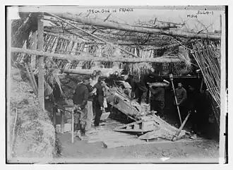 The Règlement de service en campagne (RSC), decreed on December 2, 1913, states: "Close cooperation between the various arms is necessary for a successful attack. [...] The artillery's primary role is to facilitate the infantry's forward movement. During the critical phase before an assault, it targets objectives designated for the attack, regardless of the resources required."[53] Regulations directed batteries to be placed in surveillance positions, limiting firing to expose and engage enemy troops and artillery, while conserving batteries to ensure availability. The guidelines anticipated that enemy units would seek cover in entrenchments or conceal themselves from view, requiring neutralizing fire rather than complete destruction. Ammunition reserves for each 75 mm gun at the war's outset ranged from 1,000 to 1,300 rounds, sufficient for approximately four days of sustained firing.[77][18]