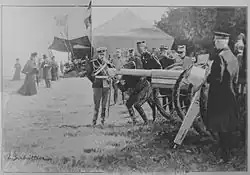 Within the Army, artillery was primarily tasked with supporting infantry, which was regarded as the central combat arm, except during siege operations against strongholds. This role shaped the armament, organization, and doctrine of French artillery, emphasizing light and mobile field guns, such as the 75 mm modèle 1897.[8] Artillery personnel were often drawn from technically skilled recruits, with approximately 70% of the École Polytechnique's 1913 graduates assigned to field artillery, followed by specialized training at the École d'application de Fontainebleau.[9][10]