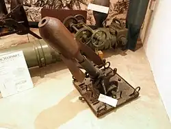 Coastal artillery was divided between the Ministry of War, responsible for coastline defenses, and the Ministry of the Navy, which oversaw military port defenses, with calibers ranging from 37 mm to 370 mm, including approximately twelve 75 mm guns.[34][7] Anti-aircraft artillery in 1914 consisted of a single prototype autocannon, with eight additional units under construction by August.[35] Depots also held older guns, including modèle 1875 95 mm guns (known as 95 mm Lahitolle), modèle 1877 90 mm guns, and modèle 1877 80 mm guns, all of the Bange system.[24]