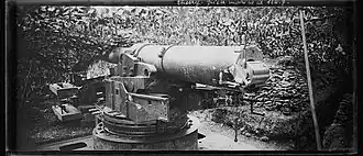 Fortress artillery, termed "artillerie de place" in 1914, equipped the forts and batteries of the Séré de Rivières system, primarily located in the eastern entrenched camps of Verdun, Toul, Épinal, and Belfort. This included rapid-fire guns such as 73 turrets, each mounting two 75 mm modèle 1905 R guns (R for "raccourci," or shortened), with 57 installed in forts and 16 stored in depots awaiting placement,[26][27] and 44 Bourges casemates, each equipped with two 75 mm modèle 1897 guns on casemate mountings.[28] Most fortification guns, however, were older Bange system models: 778 modèle 1877 80 mm guns, 3,994 modèle 1877 90 mm guns, 1,524 modèle 1875 95 mm guns, 2,296 modèle 1878 120 mm L guns (L for "long"),[29][24] 1,392 modèle 1877 155 mm L guns,[30] 331 modèle 1880 and 1880/1891 220 mm mortars, and 32 modèle 1885 and 1889 270 mm guns.[31][32] Five Bourges casemates were each armed with two modèle 1888 95 mm guns on coastal mountings.[28][33]