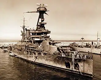 In January 1919, she went to Cattaro, where she guarded the former Austro-Hungarian Navy. She assisted in repatriating Austrian naval personnel, and escorted former Austro-Hungarian warships to France and Italy; this duty lasted until March.[1] The French Navy intended to send Lorraine and her sister Provence to the Black Sea to join operations against the Bolsheviks, but a major mutiny prevented the operation. The two ships went to Constantinople in October 1919, where they formed the core of the Eastern Mediterranean Squadron, which operated until July 1921. Lorraine underwent her first refit starting on 10 November 1921, which lasted until 4 December 1922.[5] After emerging from refit, Lorraine was placed in reserve, due to fiscal limitations in the post-war French Navy.[8] She returned to service the following year—1923—with the 1st Battleship Division of the Mediterranean Fleet.[9]